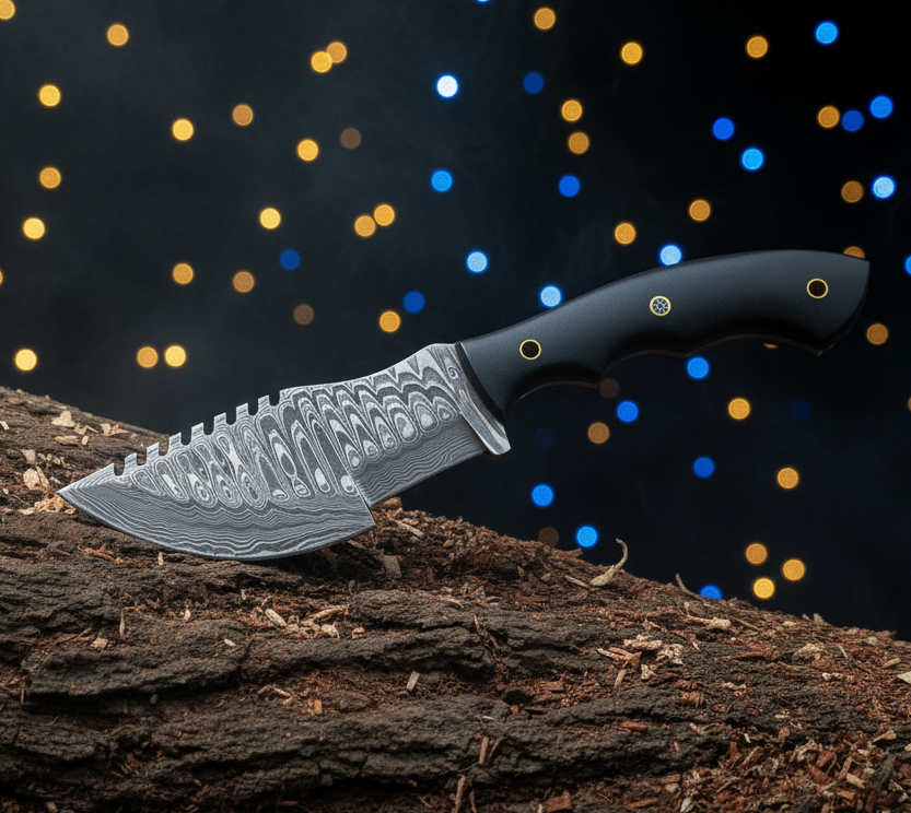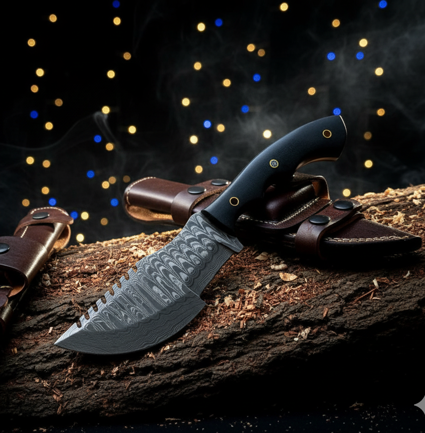 Embark on your next adventure with the rugged and reliable Compact Damascus Hunting Knife from Vicky Enterprises. This meticulously crafted blade is designed for durability and performance in the wilderness. It features a hand-forged Damascus steel blade with an eye-catching pattern and a distinctive file-work spine, enhancing both grip and aesthetic appeal. The heavy-duty blade ensures exceptional edge retention and strength, making it ideal for a variety of outdoor tasks, from processing game to preparing kindling.