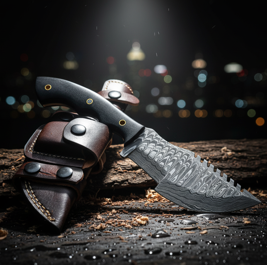 Be the first to review “Compact Damascus Hunting Knife – Heavy Duty Blade with Micarta Handle & Horizontal Leather Sheath | Vicky Enterprises” Cancel reply