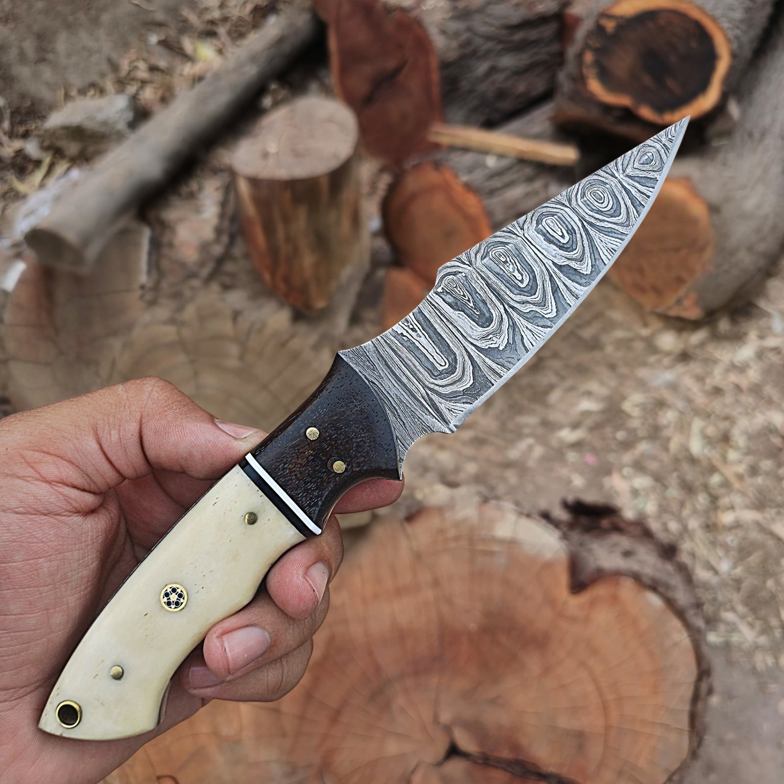 VKY KNIVES Hand-Forged Damascus Fixed Blade Knife with Bone & Wood Handle & Leather Sheath – Bushcraft / EDC