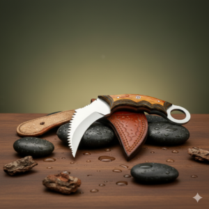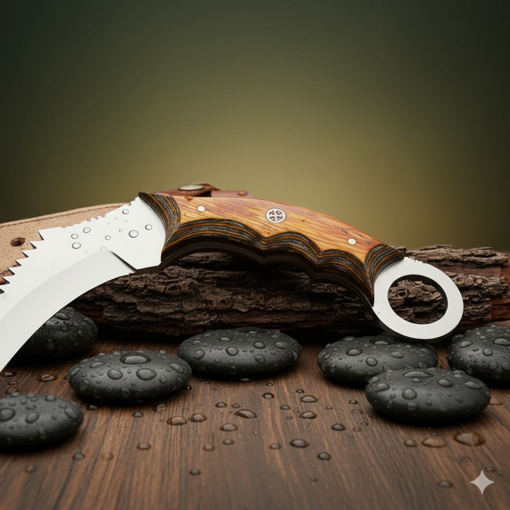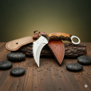 The knife is secured by a handcrafted, thick genuine leather sheath featuring a deep-quilted texture and secure snap closure. The sheath provides safe and accessible carrying, ensuring your blade is protected and ready when you need it most. This combination of durability, function, and aesthetic appeal makes this Karambit a must-have.