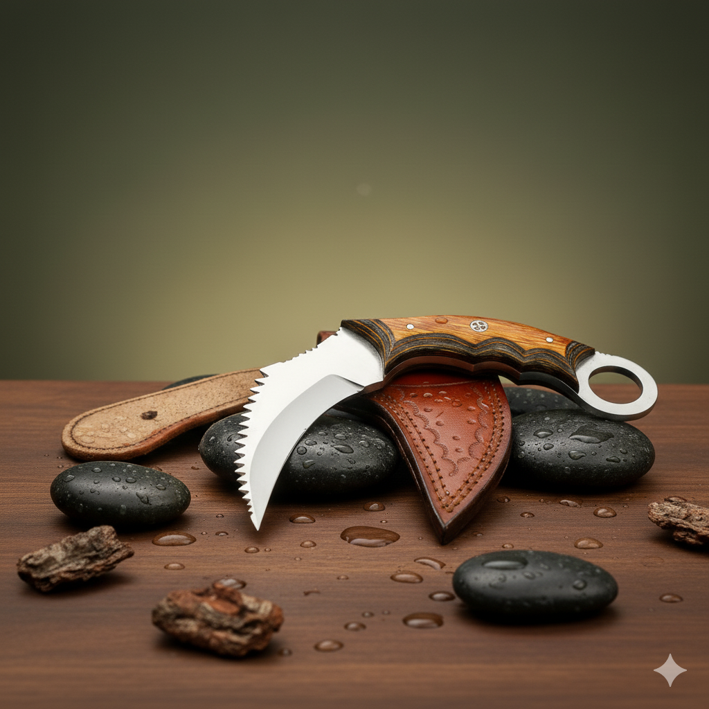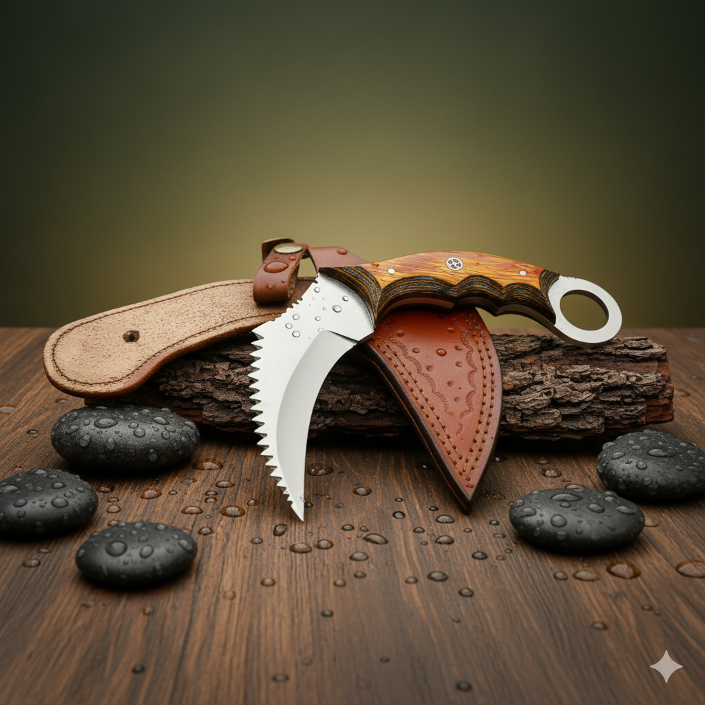 Introducing the Ultimate Tactical Karambit Fixed Blade Knife. Built for rugged use, it features a razor-sharp, serrated recurve blade for aggressive cutting and utility. The beautiful wood handle offers a secure, ergonomic grip enhanced by the signature retention finger ring. Complete with a custom-fit genuine leather sheath, this knife is perfect for survivalists, hunters, and outdoor enthusiasts.