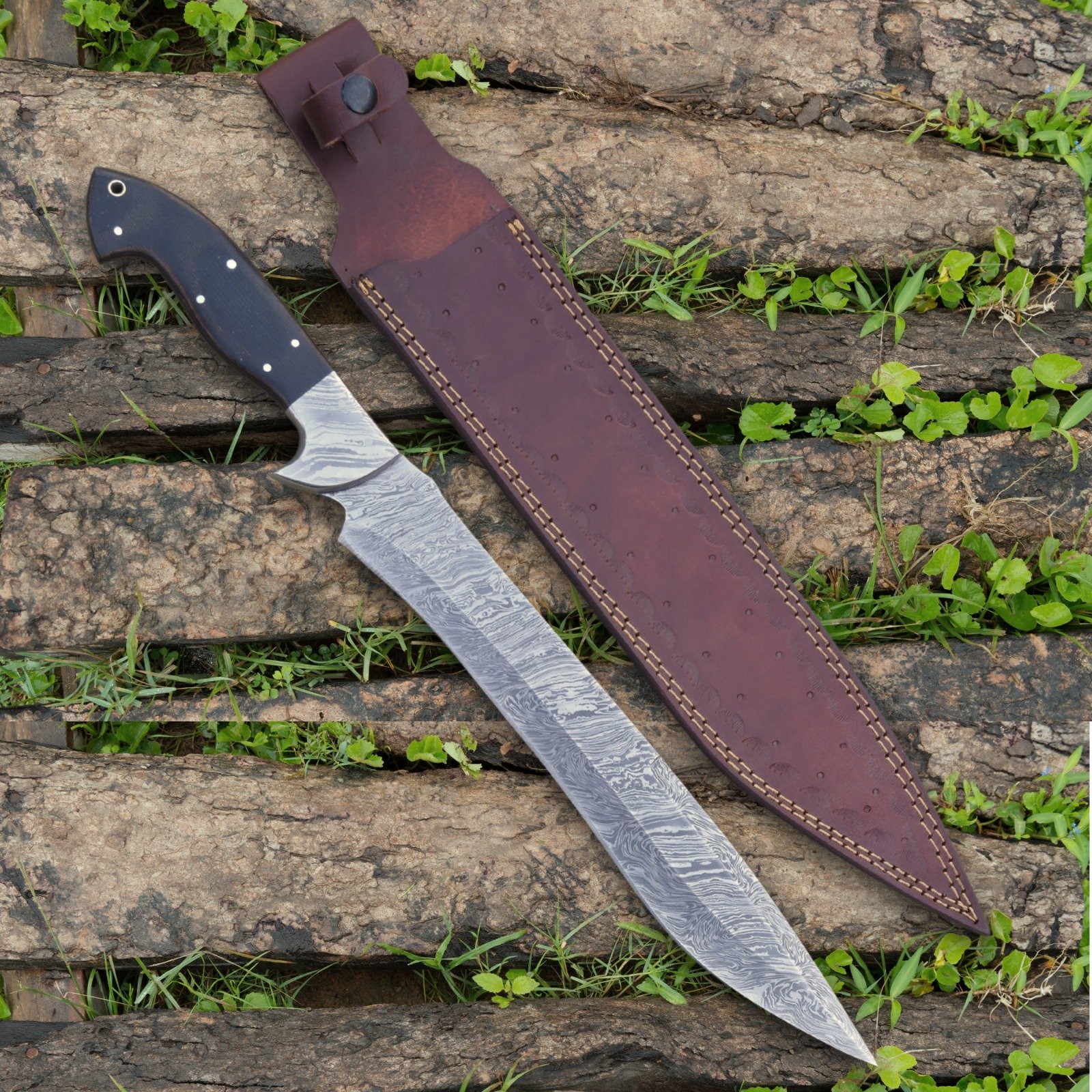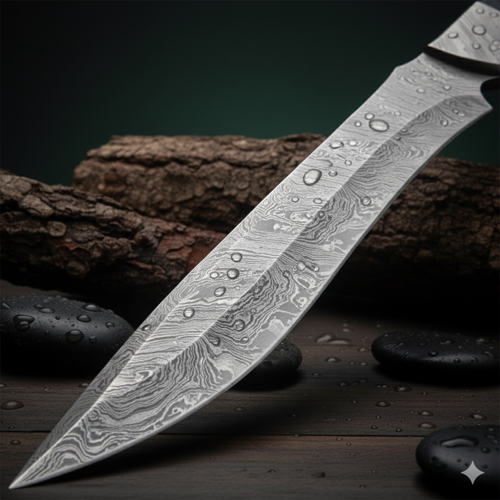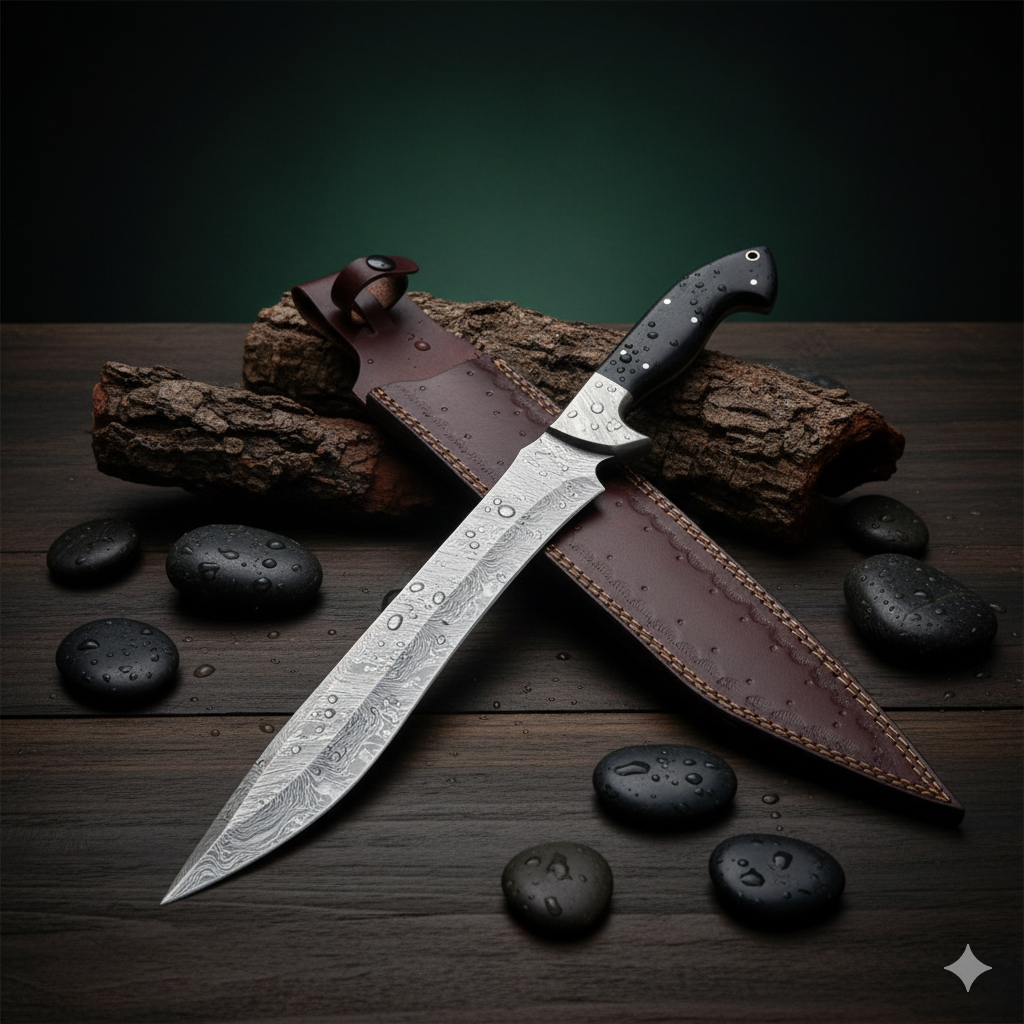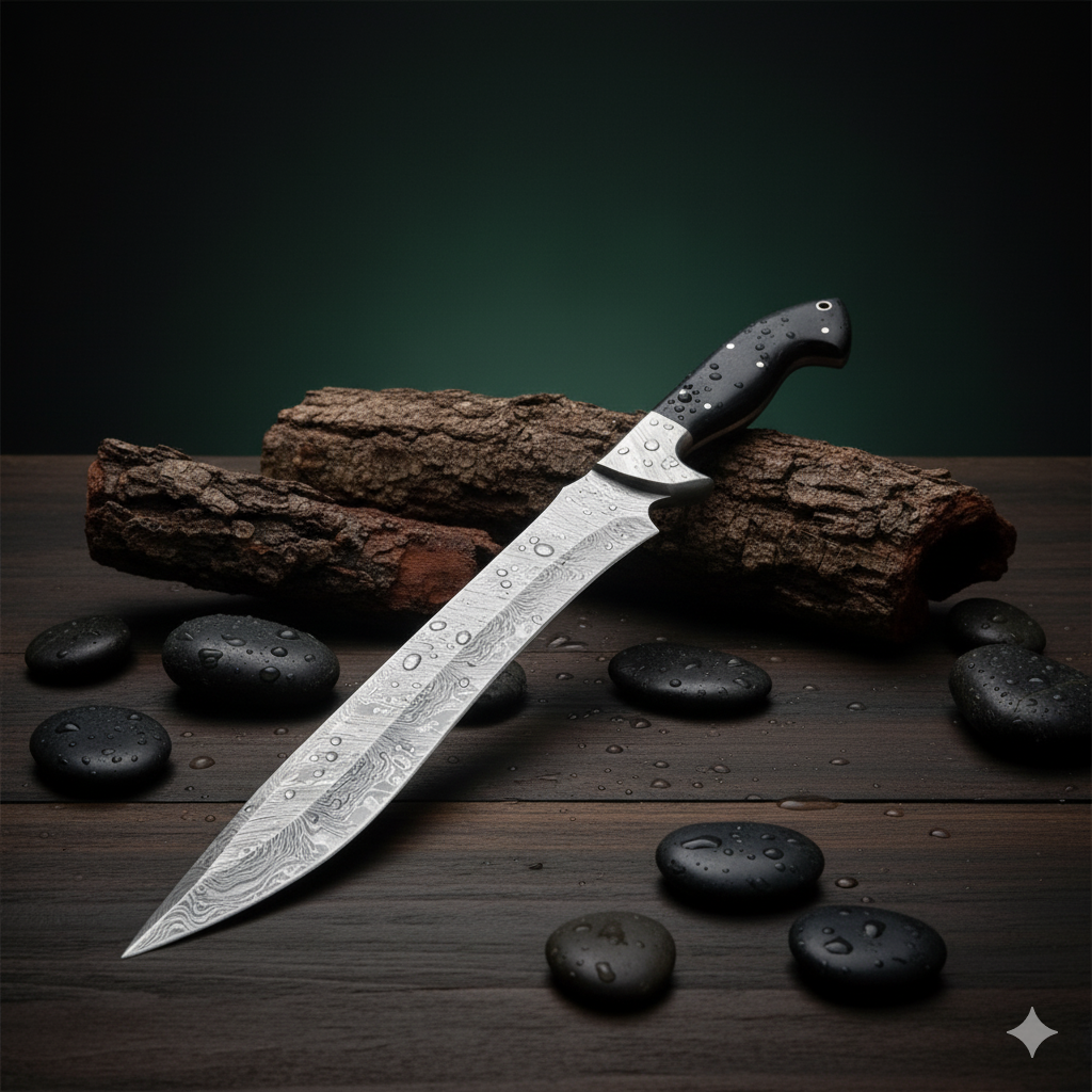 Formidable Hand-Forged Damascus Steel Blade: At the core of this powerhouse is an imposing, meticulously hand-forged Damascus steel blade. Crafted from alternating layers of high-carbon (1095) and low-carbon (15N20) steels, it undergoes a time-honored process of heating, folding, and hammering. This creates a mesmerizing and unique Damascus pattern (e.g., ladder, twist, random) that is both visually stunning and inherently functional. The blade boasts exceptional strength, flexibility, and a razor-sharp edge with superior retention, making it ideal for chopping, clearing, and heavy-duty cutting tasks.