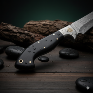 Protective D-Guard and Durable Handle: A standout feature is the integrated D-Guard, which extends from the handle to offer significant hand protection during strenuous use, deflecting impacts and ensuring a secure grip in challenging conditions. The ergonomic handle itself is crafted from a robust, dark material (e.g., Micarta, G10, or stabilized dark wood – specify if known), chosen for its excellent durability, weather resistance, and non-slip grip. Secured with sturdy pins, the full tang construction guarantees maximum integrity and balance, running the entire length of the knife.