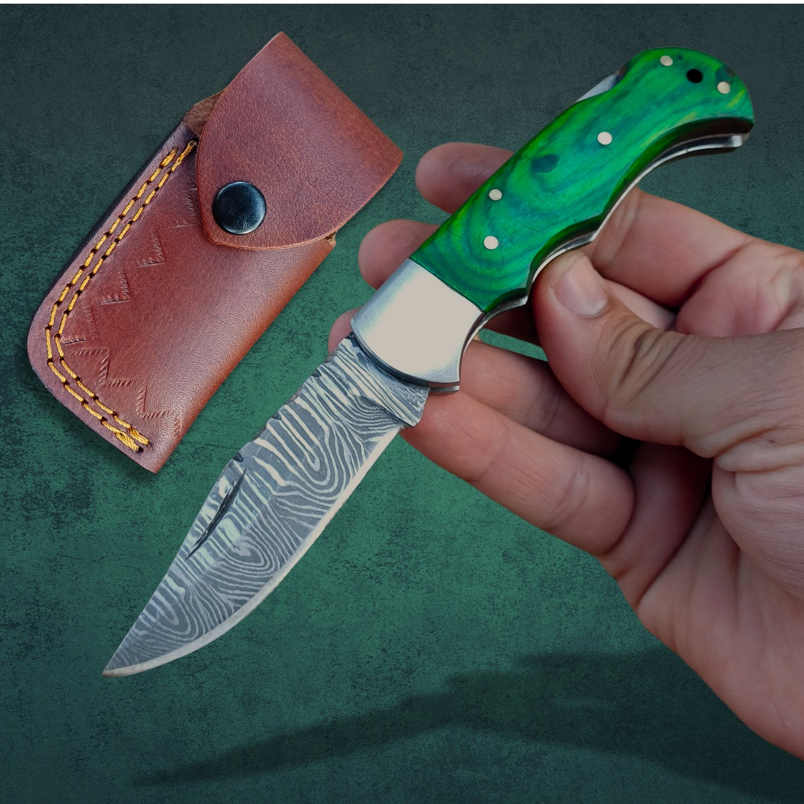 Vibrant & Unique Blue Handle with Brass Pins: The handle is a true standout, featuring a captivating Green Pakka Wood or stabilized wood material (specify if known) that shimmers with depth and character. This vibrant material is often infused or treated to create a durable, visually rich surface. Adorned with polished brass pins, the handle provides a comfortable and secure grip, while adding a touch of classic elegance. Each handle’s pattern and color variation make your knife uniquely yours.