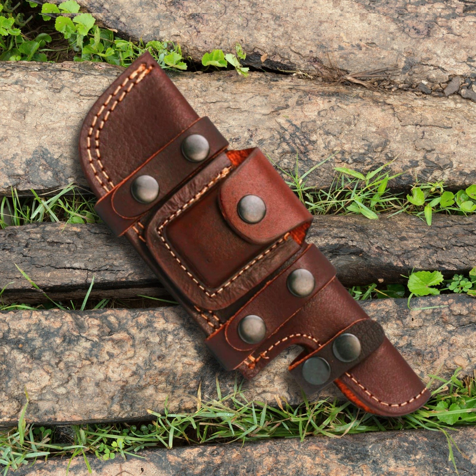 Care Instructions: To maintain the beauty and flexibility of your leather sheath, avoid prolonged exposure to water. If wet, allow it to air dry naturally away from direct heat. Condition periodically with a quality leather balm or oil to keep it supple and prevent cracking.